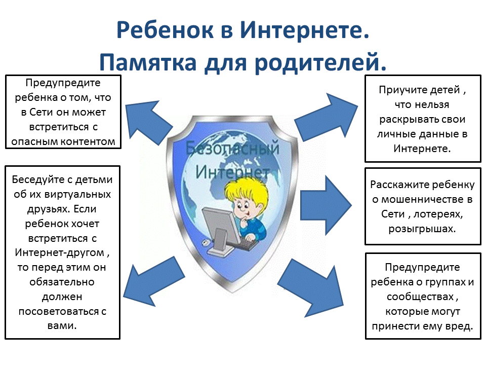 - Приучите Вашего ребенка сообщать вам о любых угрозах или тревогах, связанных с Интернетом. Напомните детям, что они в безопасности, если сами рассказали вам, о своих угрозах или тревогах. Похвалите их и посоветуйте подойти еще раз в подобных случаях.
