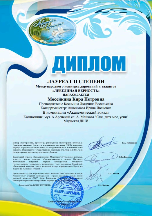 «Лебединая верность 2020» 18 декабря 2020 г. Обучающиеся Мценской ДШИ приняли участие в заочном международном конкурсе в сфере хореографии, музыкального искусства и вокального исполнительства «Лебединая верность 2020 »18 декабря 2020 г. У условиях пандемии конкурс с очного переквалифицировался в заочный. Учредителем, организатором,