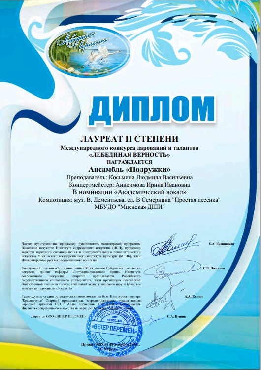 вокальный ансамбль «Подружки» - лауреат II степени, преподаватель