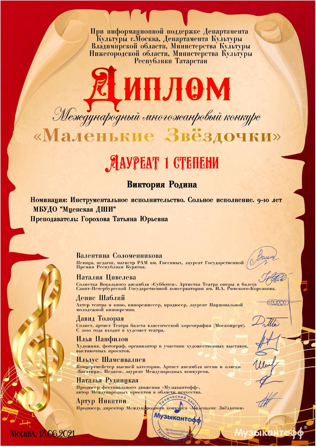 | 7 июня 2021 года прошел Международный многожанровый конкурс "Маленькие звездочки". Цель этого конкурса - создание условий для дальнейшего творческого развития детей до 12 лет. В номинации инструментальное исполнительство участвовали Родина Виктория - лауреат 1 степени, Смирнов Ратмир - лауреат 2 степени. Оценивались музыкальность, артистизм, качество звучания. В составе жюри были профессиональные педагоги, композиторы, актеры кино. | |