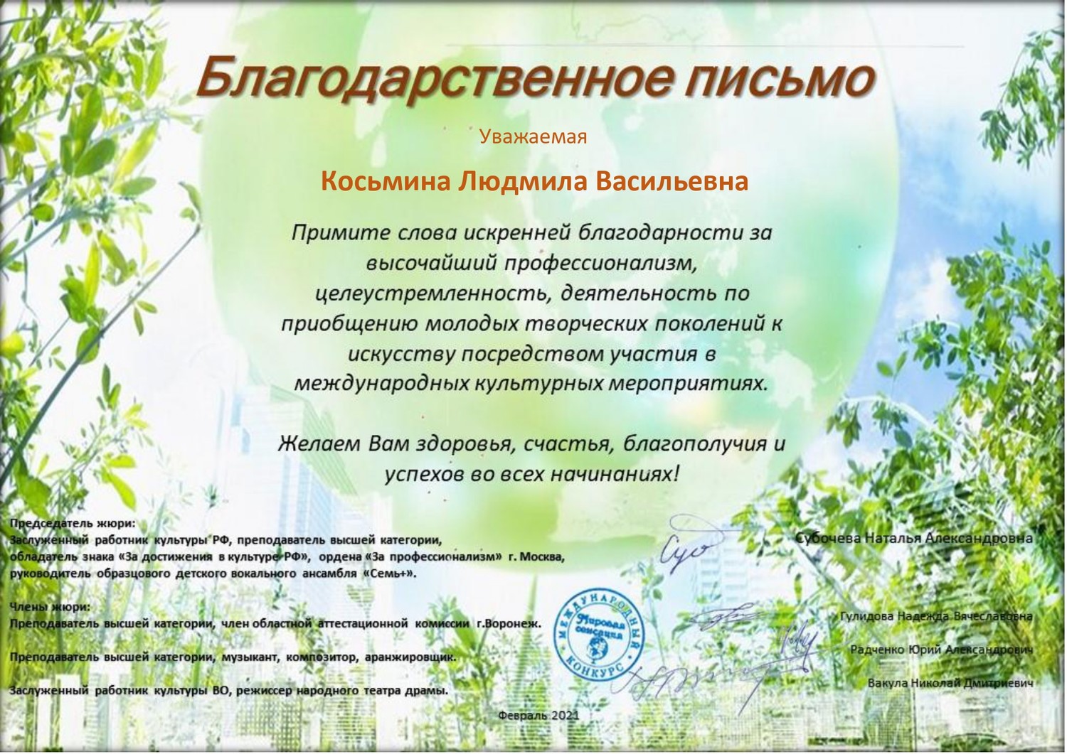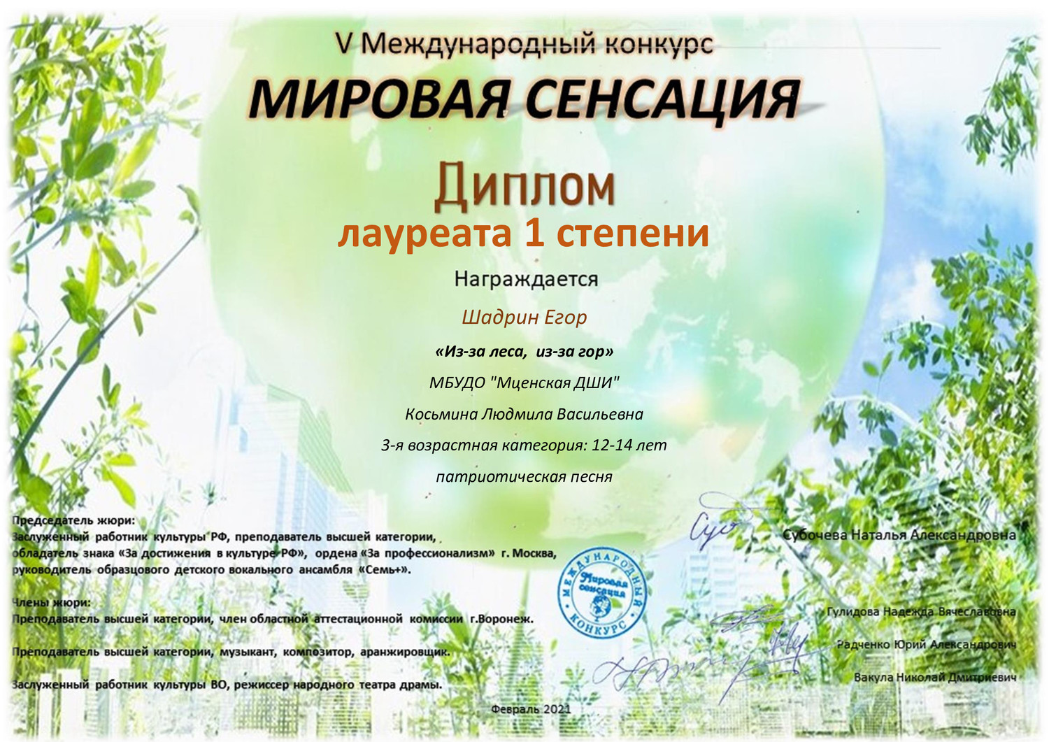 | Обучающиеся Мценской детской школы искусств успешно выступили в V Международном конкурсе "Мировая сенсация" г. Воронежа. Дипломами Лауреата I степени награждены: Шадрин Егор - возрастная категория 12-14 лет "Патриотическая песня"; Шадрин Фёдор - возрастная категория 9-11 лет "Эстрадный вокал" Гришина Милана - возрастная категория 9-11 лет "Эстрадный вокал" Шохина Анна - возрастная категория 9-11 лет "Эстрадный вокал" Благодарственным письмом была отмечена преподаватель хорового отделения МБУДО "Мценская ДШИ" Косьмина Людмила Васильевна за высокий профессионализм, целеустремленность, деятельность по приобщению молодых творческих поколений к искусству. | |