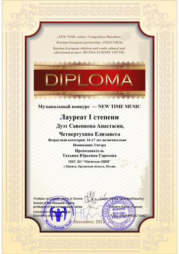 Поздравляем обучающихся отделения «Народные инструменты» МБУДО «Мценская ДШИ» Савенкову Анастасию и Четвертухину Елизавету, а также их преподавателя Горохову Татьяну Юрьевну с успехами на конкурсе "New time music". Пусть удача всегда сопутствует вам на пути к новым вершинам! | |