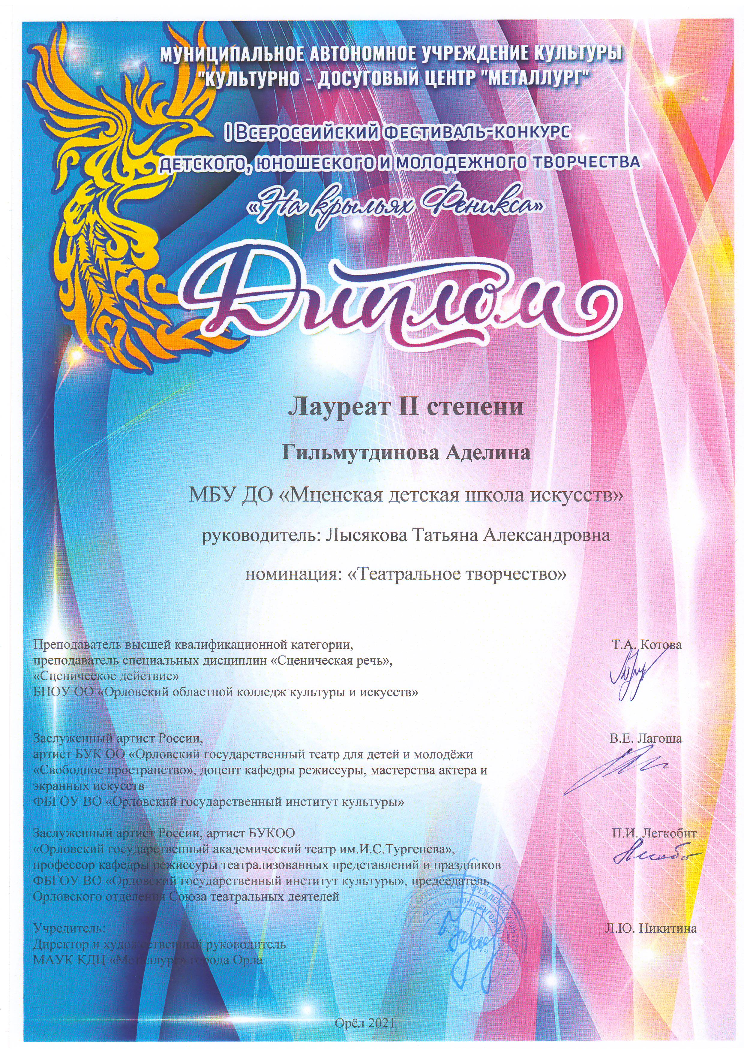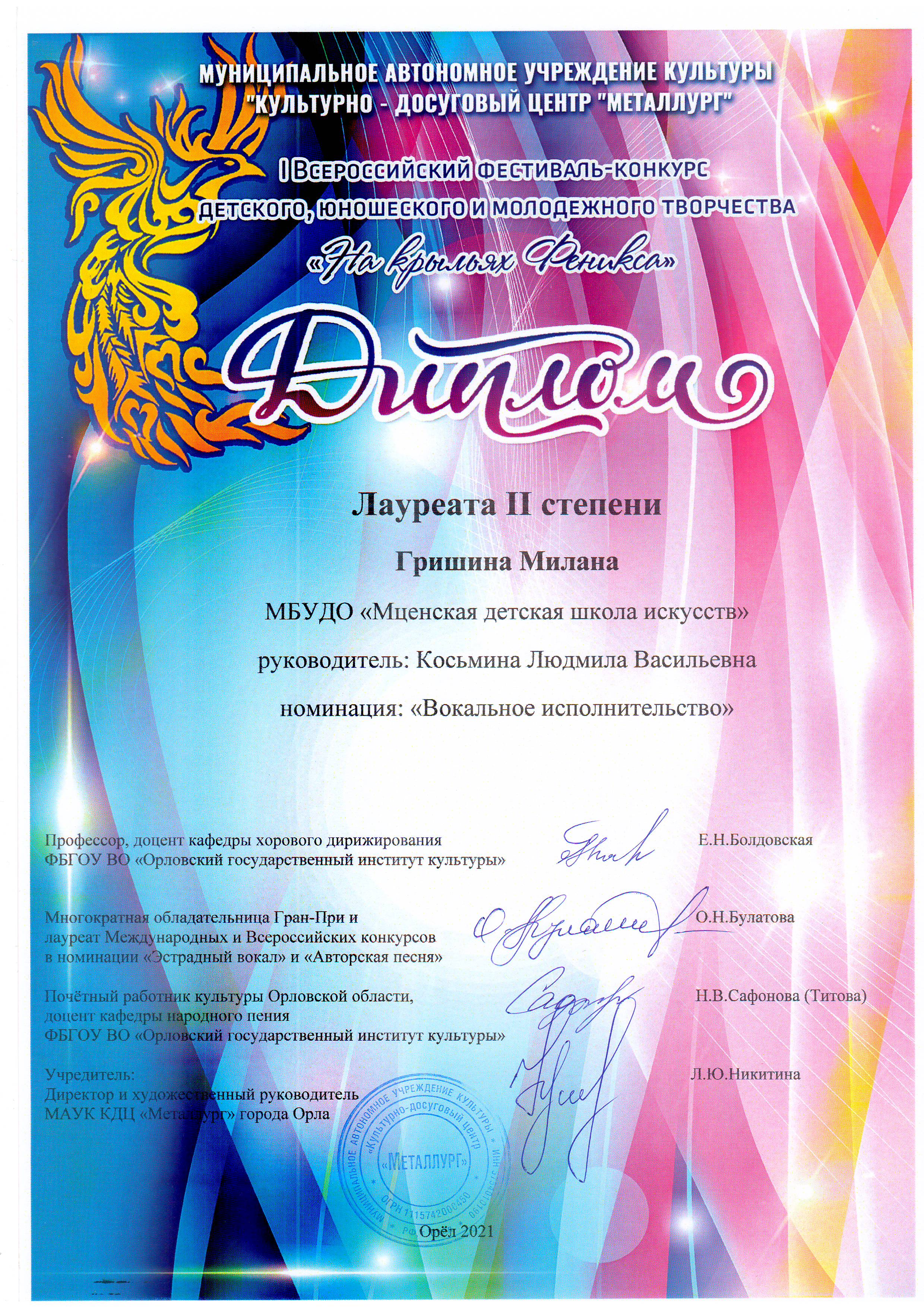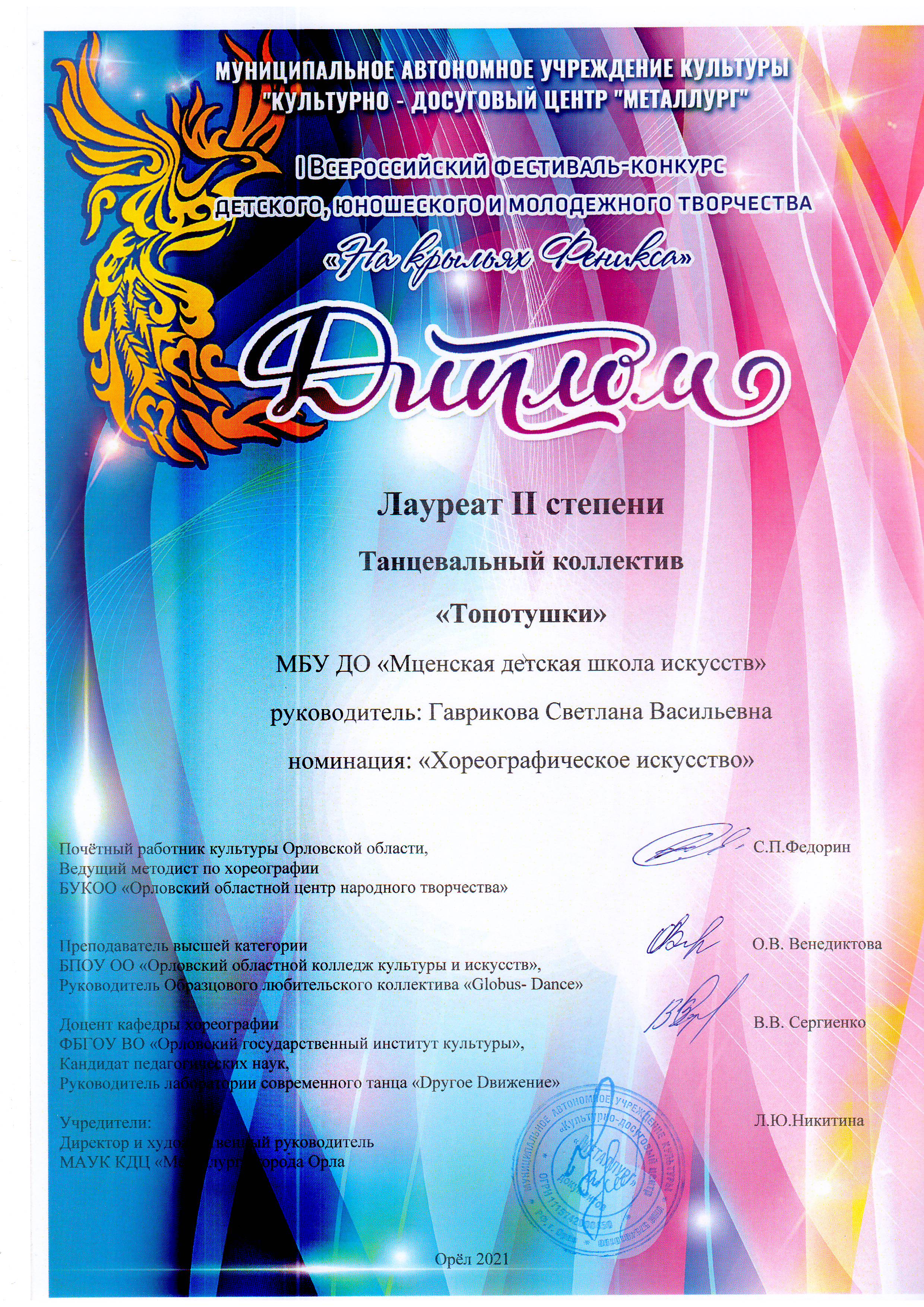 Начало февраля порадовало нас приятным известием о победах наших обучающихся на I Всероссийском конкурсе детского, юношеского и молодежного конкурса «На крыльях Феникса», который проводил ДК «Металлург» г. Орла. Наши обучающиеся выступали в 3 номинациях: «Хореография», «Вокальное исполнительство», «Театральное творчество». И во всех номинациях у нас высокие призовые места! Ансамбль «Топотушки» лауреат II степени - руководитель Гаврикова Светлана Васильевна, Гришина Милана лауреат II степени, Шадрин Егор дипломант I степени, Шадрин Федор лауреат III степени - руководитель Косьмина Людмила Васильевна, Гильмутдинова Аделина лауреат II степени, Андрюшина Диана дипломант I степени, Мукимова Ксения дипломант II степени - руководитель Лысякова Татьяна Александровна.
