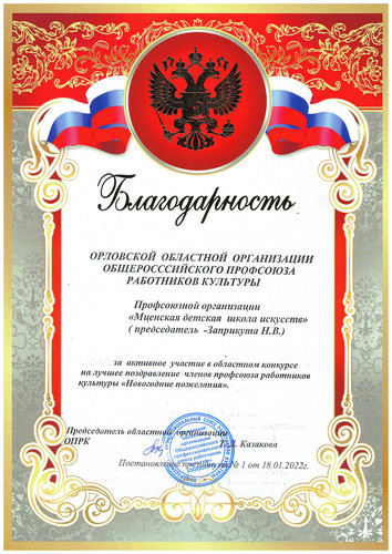 За активное участие в конкурсе наш профсоюзный ансамбль удостоился благодарности Орловской областной организации общероссийского профсоюза работников культуры.