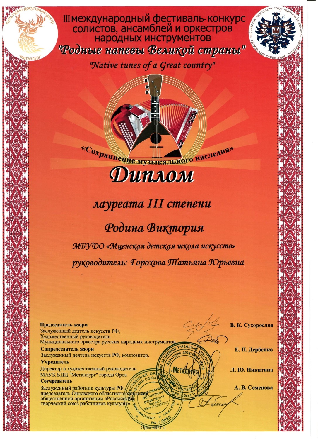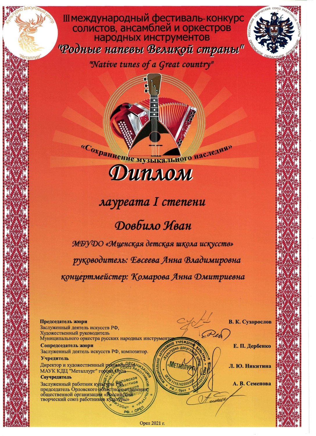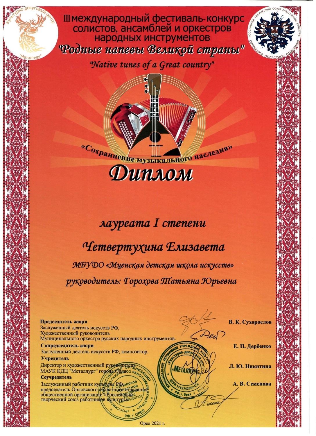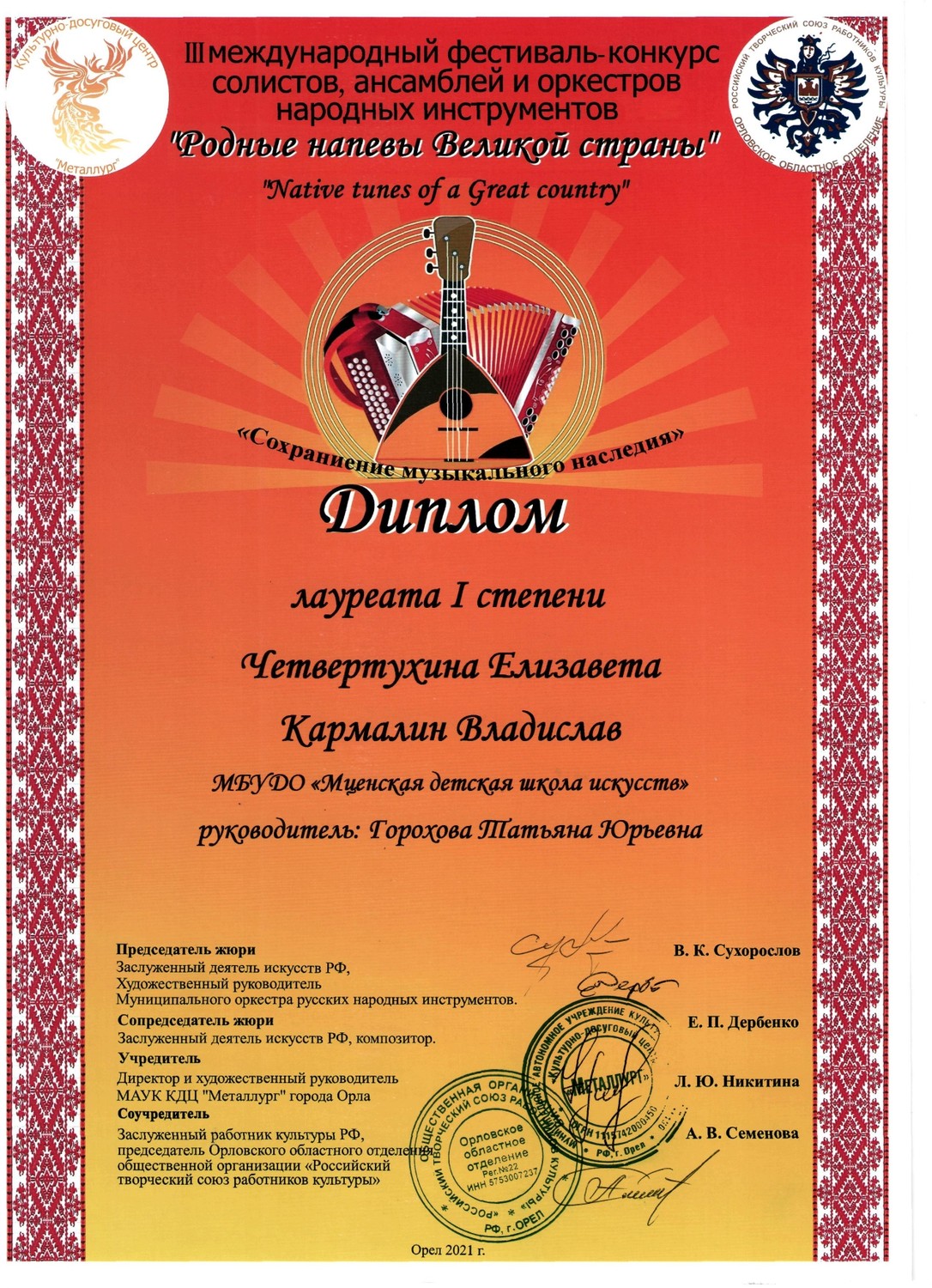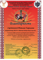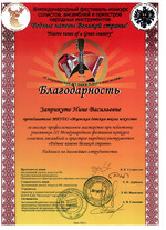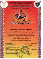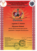 С 29 по 31 октября в культурно - досуговом центре «Металлург» прошел III международный фестиваль-конкурс солистов, ансамблей и оркестров русских народных инструментов «Родные напевы Великой страны». Председатель жюри конкурса Сухорослов В.К., сопредседатель Дербенко Е.П., члены жюри Воронцов В.А., Антонов А.А., Бурченков В.А., Максимова М.И. Чтобы определить лучших, жюри нужно было учесть много критериев - культура владения инструментом, исполнительское мастерство и техника, музыкальность, яркость, художественная ценность, воплощение художественного образа, индивидуальность, артистичность… Это всё профессиональные вещи. От нашей школы 11 обучающихся приняли участие в фестивале-конкурсе и все удостоены высоких наград. ЛАУРЕАТЫ I СТЕПЕНИ Дуэт гитаристов: Четвертухина Елизавета, Кармалин Владислав, преподаватель Горохова Т.Ю. Довбило Иван, балалайка, преподаватель Евсеева А.В., концертмейстер Комарова А.Д. ЛАУРЕАТЫ II СТЕПЕНИ: Довбило Павел, аккордеон преподаватель Анкудинов К.В. Труханов Матвей, гитара преподаватель Заприкута Н.В. ЛАУРЕАТЫ III СТЕПЕНИ: Родина Виктория, гитара, преподаватель Горохова Т.Ю. Смирнов Ратмир, гитара, преподаватель Горохова Т.Ю. Сычёва Полина, гитара, преподаватель Заприкута Н.В. Мельникова Алёна, гитара, преподаватель Заприкута Н.В. Коровкин Егор, гитара, преподаватель Заприкута Н.В. ДИПЛОМАНТ Гильмутдинова Эвелина, домра, преподаватель Евсеева А.В., концертмейстер Сиротинина Т.Г.