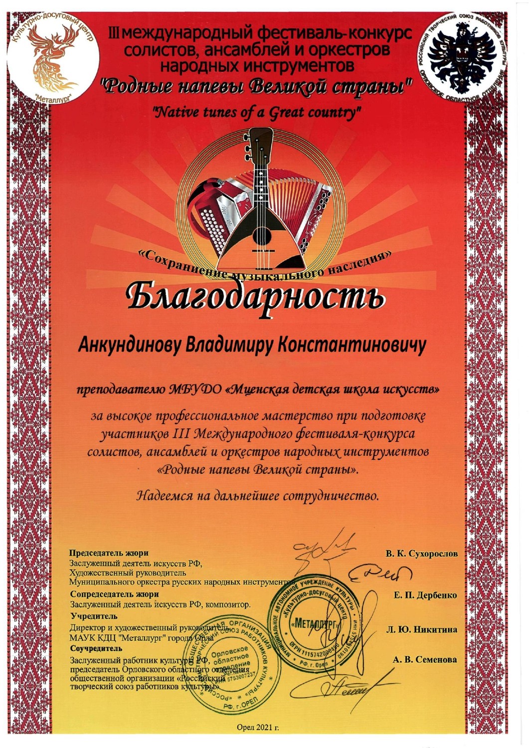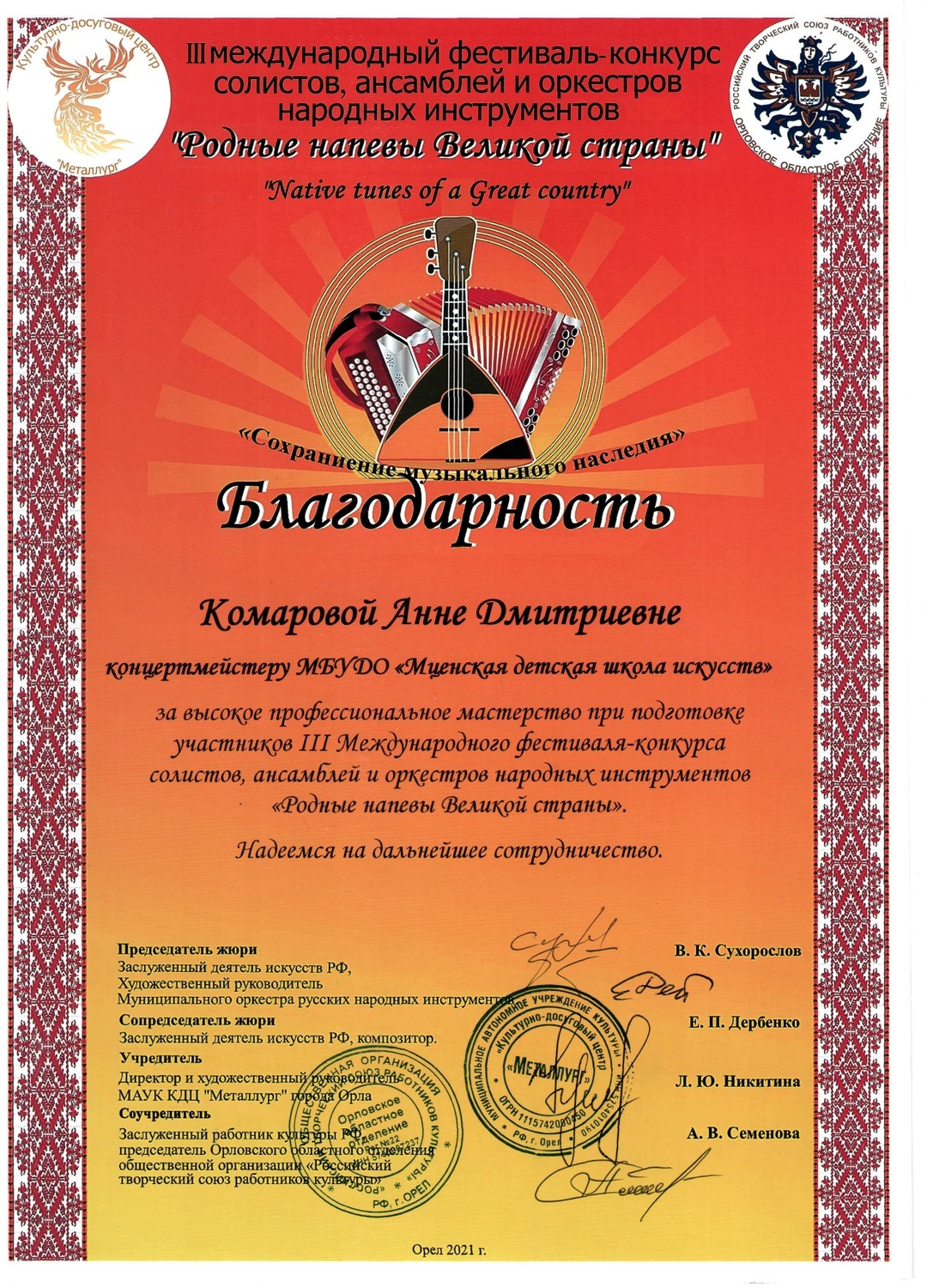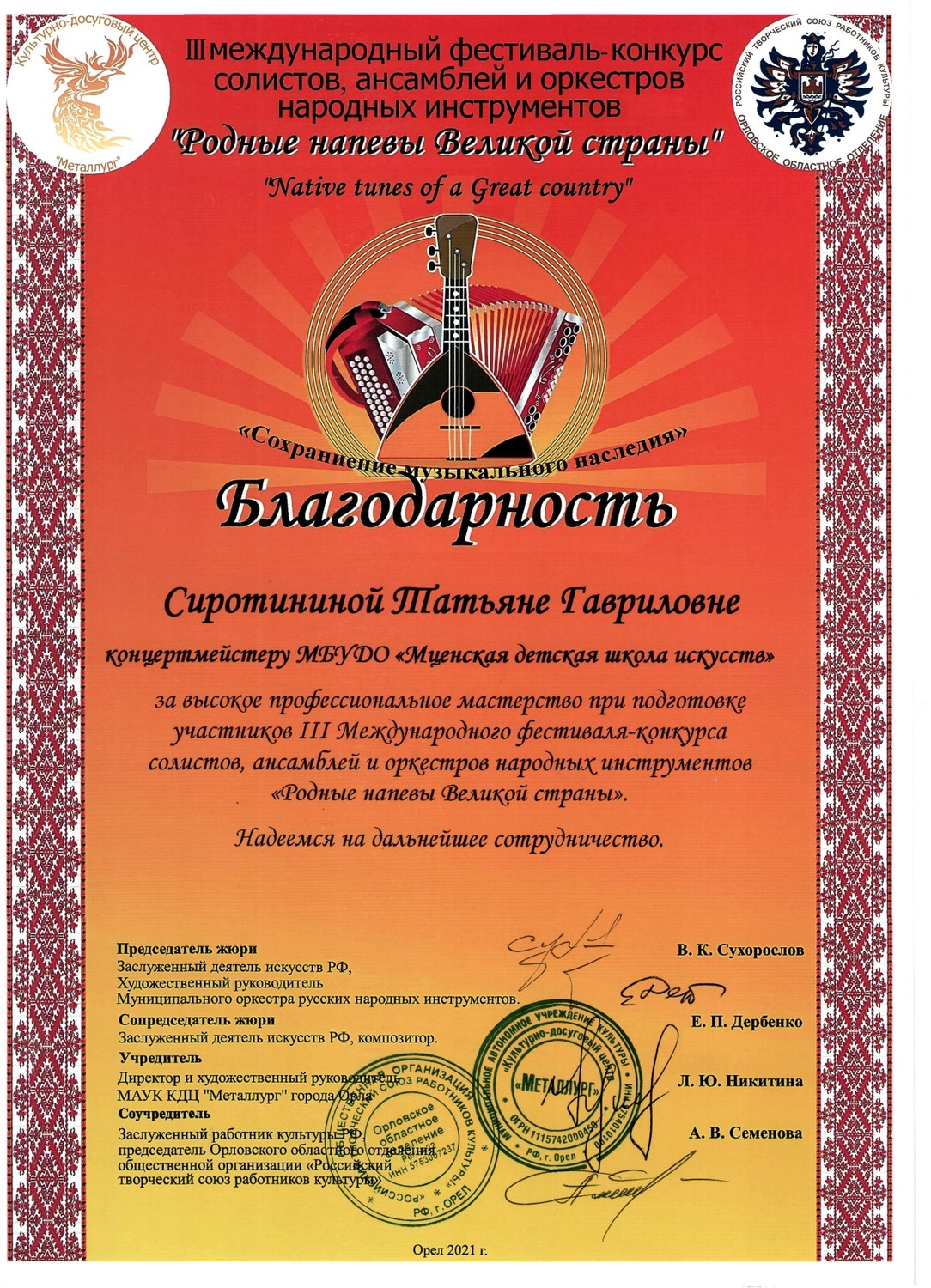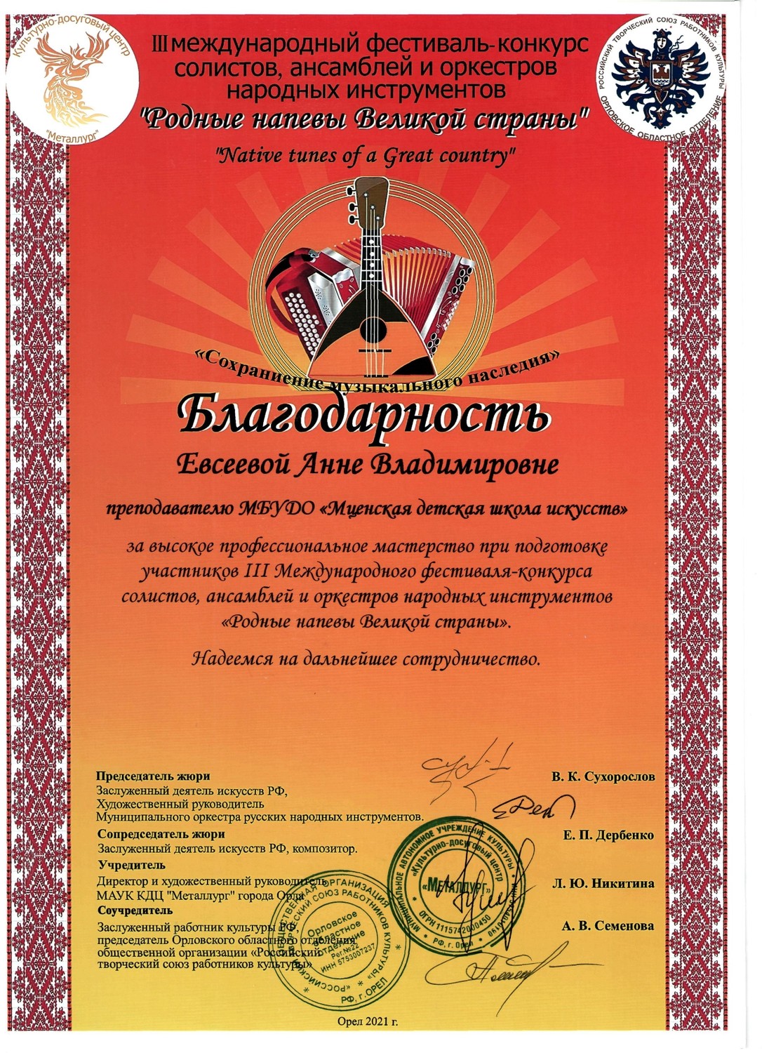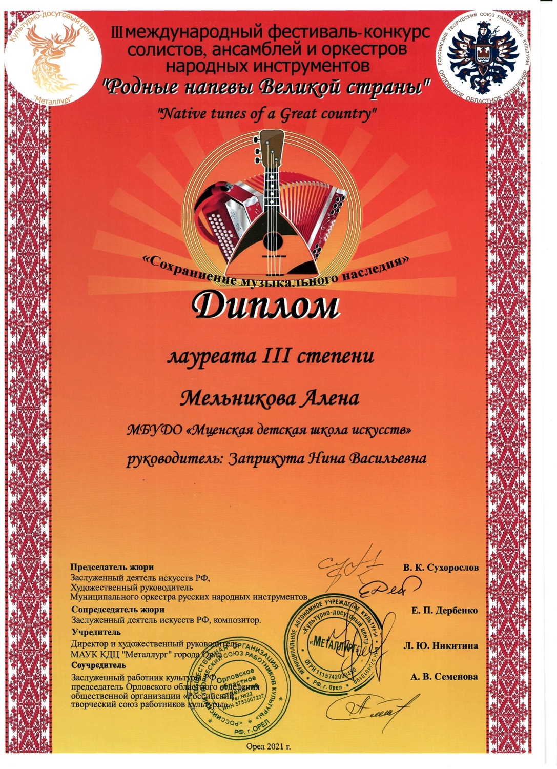 С 29 по 31 октября в культурно - досуговом центре «Металлург» прошел III международный фестиваль-конкурс солистов, ансамблей и оркестров русских народных инструментов «Родные напевы Великой страны». Председатель жюри конкурса Сухорослов В.К., сопредседатель Дербенко Е.П., члены жюри Воронцов В.А., Антонов А.А., Бурченков В.А., Максимова М.И. Чтобы определить лучших, жюри нужно было учесть много критериев - культура владения инструментом, исполнительское мастерство и техника, музыкальность, яркость, художественная ценность, воплощение художественного образа, индивидуальность, артистичность… Это всё профессиональные вещи. От нашей школы 11 обучающихся приняли участие в фестивале-конкурсе и все удостоены высоких наград. ЛАУРЕАТЫ I СТЕПЕНИ Дуэт гитаристов: Четвертухина Елизавета, Кармалин Владислав, преподаватель Горохова Т.Ю. Довбило Иван, балалайка, преподаватель Евсеева А.В., концертмейстер Комарова А.Д. ЛАУРЕАТЫ II СТЕПЕНИ: Довбило Павел, аккордеон преподаватель Анкудинов К.В. Труханов Матвей, гитара преподаватель Заприкута Н.В. ЛАУРЕАТЫ III СТЕПЕНИ: Родина Виктория, гитара, преподаватель Горохова Т.Ю. Смирнов Ратмир, гитара, преподаватель Горохова Т.Ю. Сычёва Полина, гитара, преподаватель Заприкута Н.В. Мельникова Алёна, гитара, преподаватель Заприкута Н.В. Коровкин Егор, гитара, преподаватель Заприкута Н.В. ДИПЛОМАНТ Гильмутдинова Эвелина, домра, преподаватель Евсеева А.В., концертмейстер Сиротинина Т.Г.