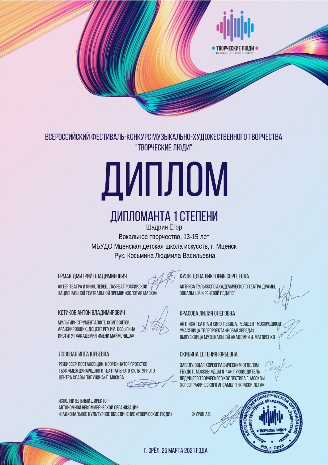 Для участия было подано 5454 заявки из многих российских городов, а также из Белоруссии, Казахстана, Канады и других стран. В состав жюри конкурса вошли артисты России, мастера вокального и музыкального исполнительства, известные хореографы, актеры и режиссеры, ведущие преподаватели ВУЗов культуры и искусств России. Участие в этом конкурсе приняли обучающиеся МБУДО «Мценская ДШИ» Шадрин Егор и Шадрин Федор (преподаватель Косьмина Людмила Васильевна). После тщательной работы профессионального жюри награды получили: - Шадрин Федор в возрастной категории 9-12 лет – Лауреат 1 степени; - Шадрин Егор в возрастной категории 13-15 лет – Диплом дипломанта 1 степени. | |